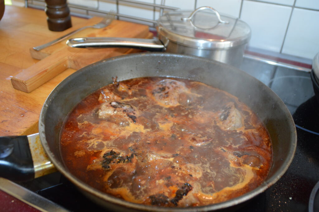 Es gibt manchmal fertige Rindsjus zu erstehen – ich mache den doch eher selbst, wenn meine Gattin außer Haus weilt, wohlgemerkt. Das langsame Einkochen von Rindsknochen, Fleisch-Abschnitten und Tomatenmark, Gemüsen und Gewürzen verursacht einen kräftigen Duft, den nicht alle lieben. Die dann hergestellte Sauce ist unerlässlich für einen guten Zwiebelrost- braten, Rindsrouladen oder eben auch eine Kalbsleber mit Beilage wie Erdapfelpüree oder Reis.