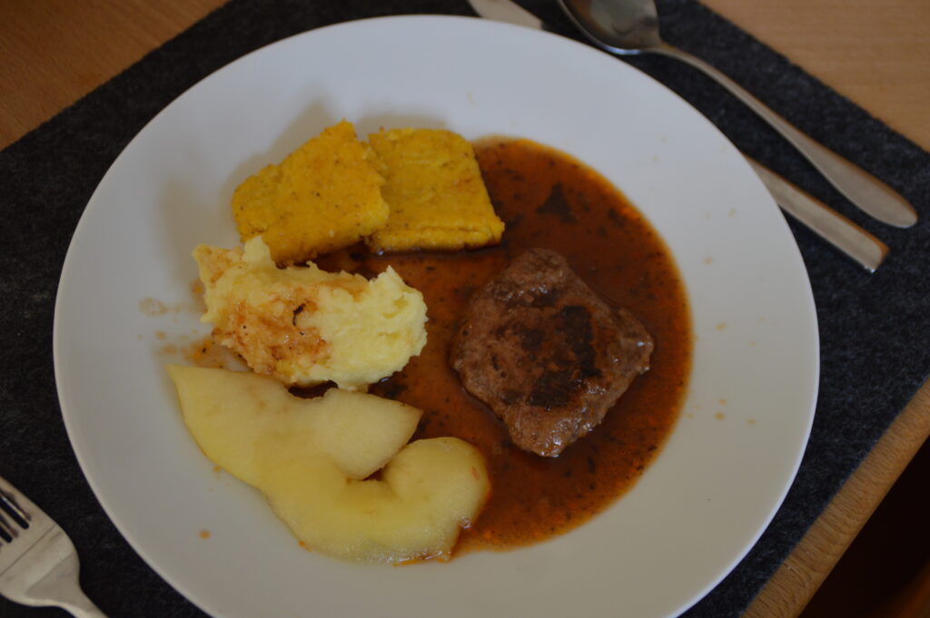 Den Bratrückstand etwas mehlen, mit etwas Suppe oder gleich mit dem Rindsjus auffüllen. Pfeffer schadet nicht – je nach Geschmack! Wenn die Beilagen und die Früchte fertig sind, die Leber noch kurz in die heiße Rindssauce geben und zum Tisch bringen.