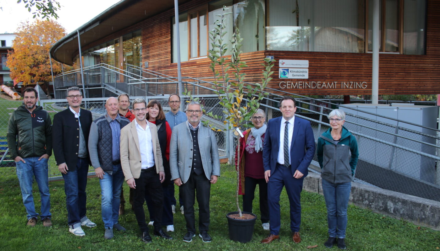 Zusammen mit Andrä Stigger, dem Klimabündnis-Geschäftsführer, hat LR Zumtobel die Gemeinde besucht, um sich vor Ort mit den Gemeinderät:innen auszutauschen und sich ein Bild von den örtlichen Klimaschutzmaßnahmen zu machen. Während LR Zumtobel, der auch Obmann des Klimabündnis Tirol ist, im Rahmen von Aufforstungen rund um den Jubiläumsbesuch in Inzing selbst zur Schaufel griff, gab es vom Klimabündnis-Geschäftsführer einen Apfelbaum als Jubiläumsgeschenk. Er dankte den engagierten Gemeinderät:innen und weiteren engagierten Personen im Ort im Rahmen des Zusammentreffens.