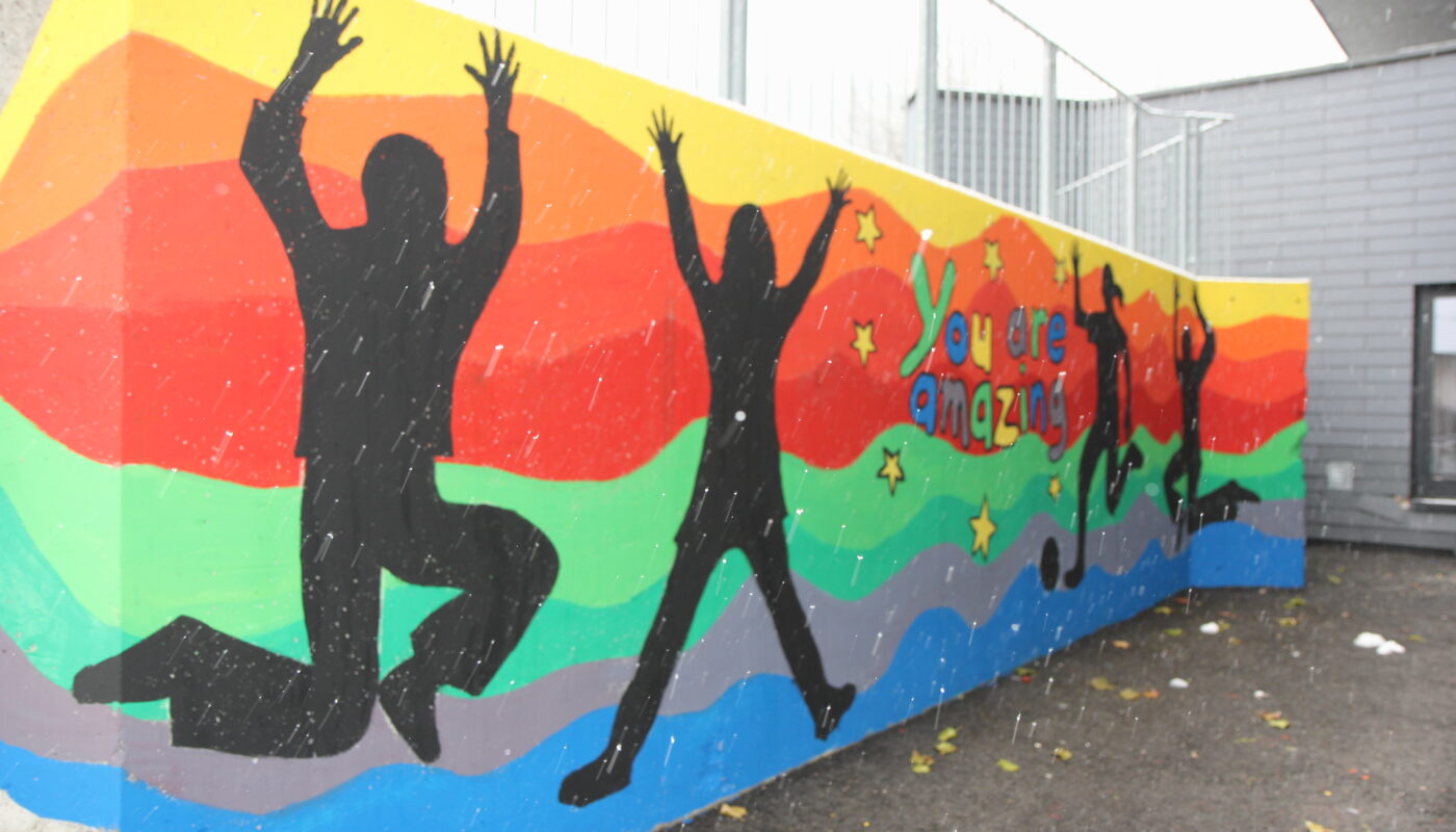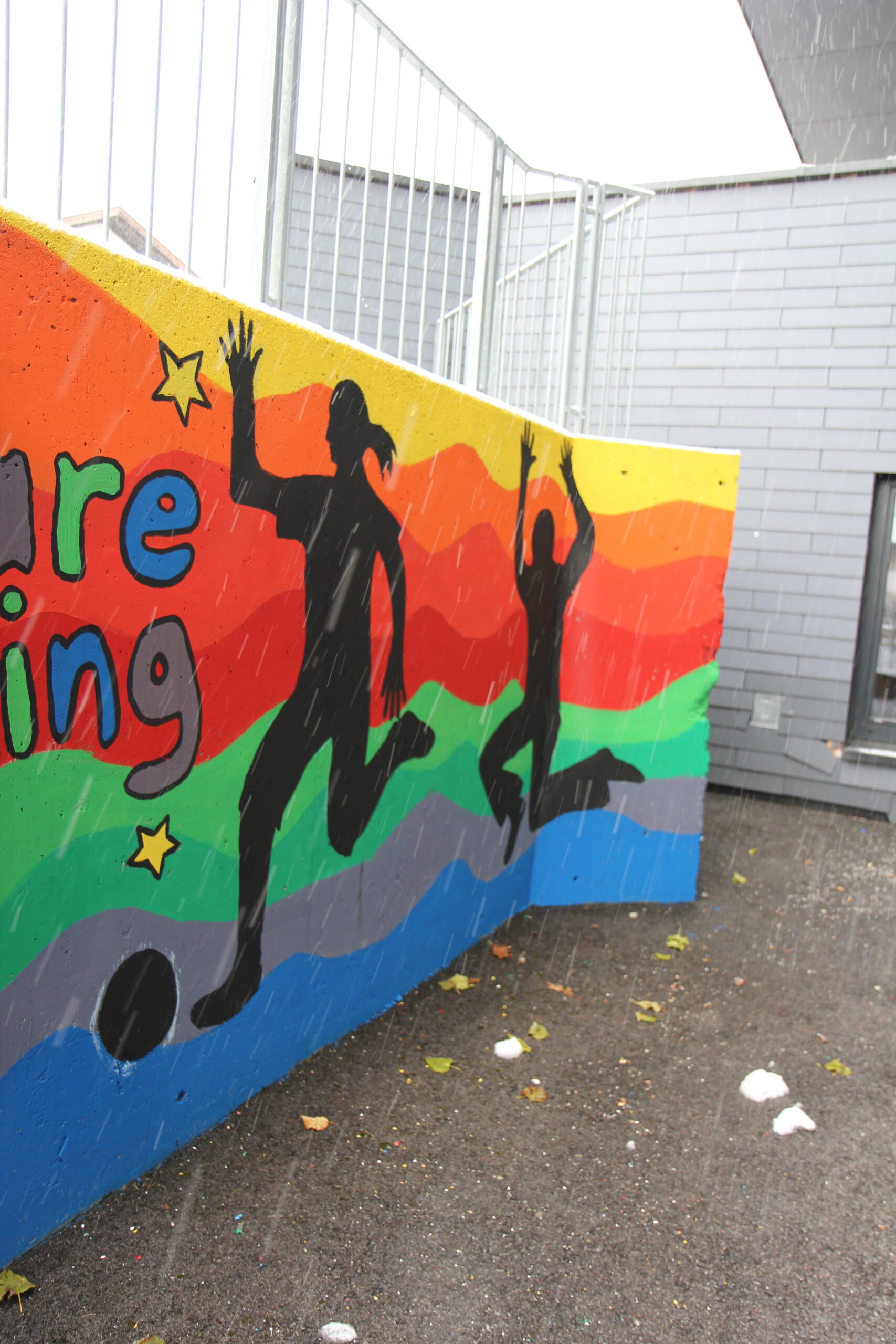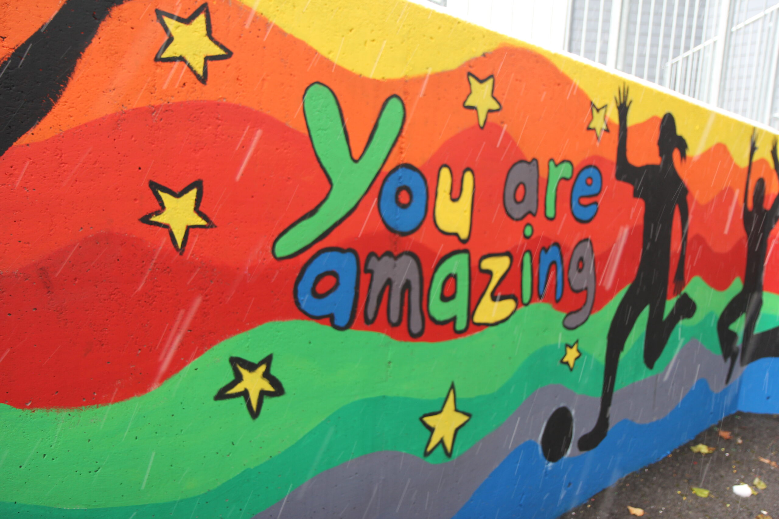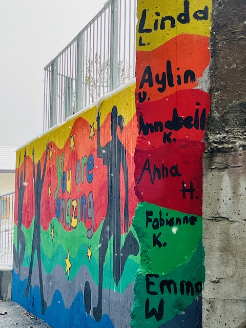 An einem der ersten Schneetage im November stapfe ich hinauf zur Inzinger Mittelschule; es ist kalt und ungemütlich. An meiner linken Schulter baumelt schwer die Kamera. Bei dickflockigem Schneetreiben schlage ich den Weg über den Parkplatz Richtung Haupteingang ein. Nun folgt die schmale Pflasterung. Ich nehme aber nicht die Treppen zum Eingang hinauf, sondern gehe weiter geradeaus. Die Wand unterhalb der Treppe, direkt einem großen Werkraum gegenüber, strahlt farbenfroh in das müde Wintergrau. „You are amazing“ steht in großen Lettern umrahmt von gelben Sternen auf einem harmonisch bunten Hintergrund geschrieben; lebensgroße Schattenrisse in verschiedenen Posen schweben wie lebendige Scherenschnitte fast tanzend über die facettenreich leuchtende Fläche. Während rasche Schneeflocken vor die Kameralinse fallen, mache ich ein paar Fotos.