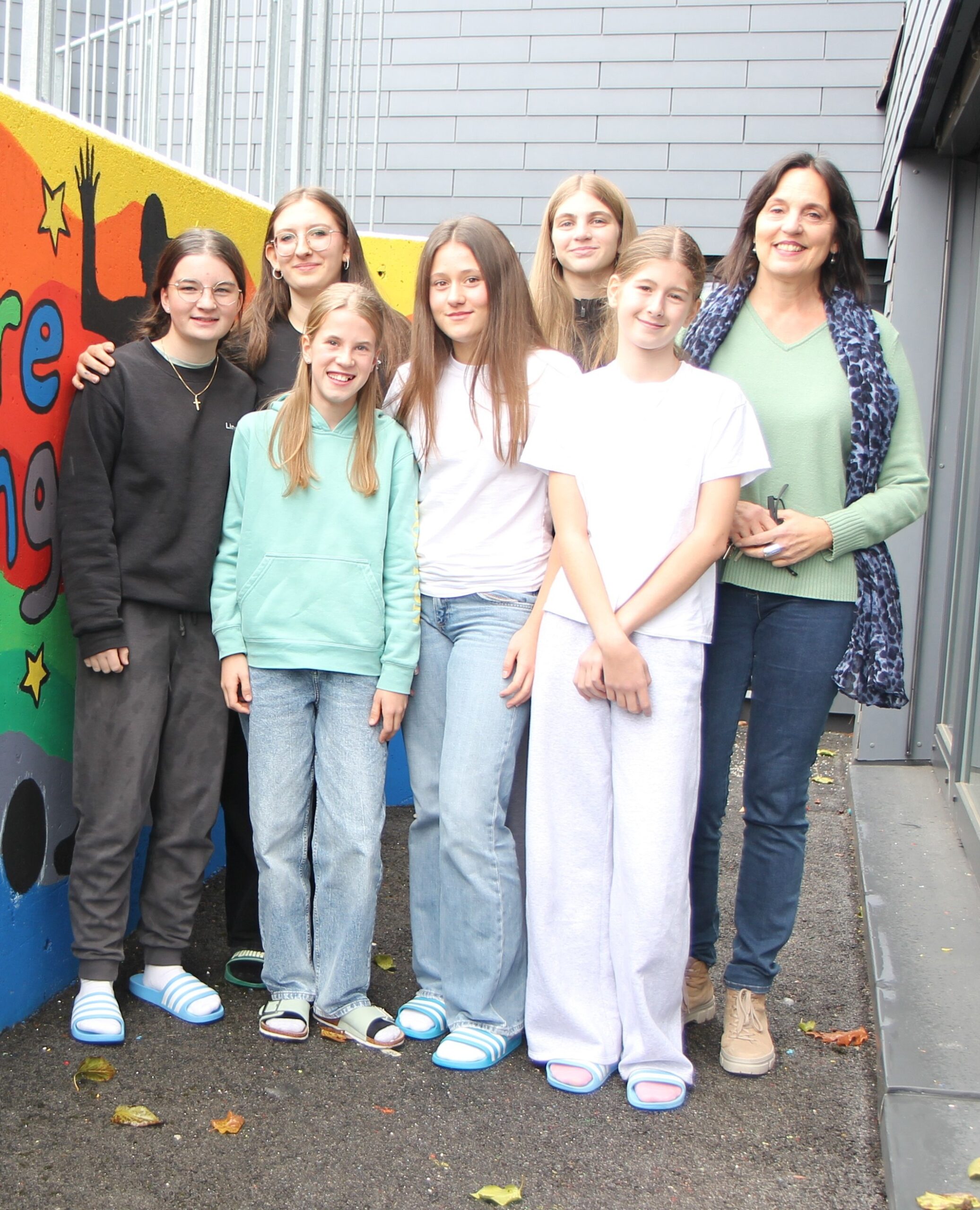 Die Mädchen, die das Wandbild, den wunderbaren Farbenbogen mutmachender Botschaft, an die graue Fläche gezaubert haben, erwarten mich bereits im ersten Stock der Mittelschule zusammen mit ihrer Lehrerin Monika März, die in der Klasse auch Kunst unterrichtet. Als Klassenvorständin begleitet Frau März die Mädchen Fabienne, Aylin, Anna, Emma, Linda und Annabell bereits das vierte Schuljahr. Frau März und ihre Mädchen das ist ein herzliches Miteinander, ein harmonisches Selbstverständnis auf Augenhöhe, ein respektvoller Zusammenhalt. Diese Gemeinschaftspower spürt man im Wandbild, auf dem einem die Botschaft lebendig-lebhaft entgegen tanzt.
