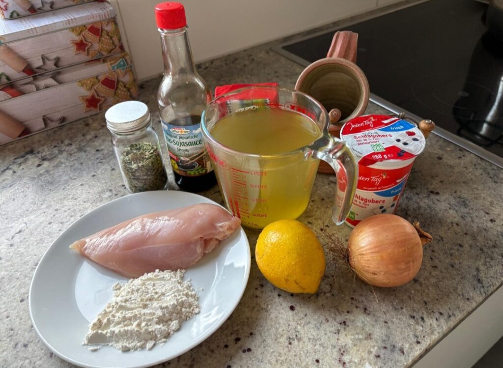 Melt the butter and cook the onion in a covered saucepan for 15 – 20 minutes. Add the chicken pieces and tarragon and cook for 5 minutes. Stir in the flour and cook for 1 minute. Gradually add the stock, lemon rind, lemon juice and soy sauce. Cover and cook until the chicken is tender. Allow to cool and then stir in the cream (or milk). Gently reheat without boiling, season to taste and serve with crusty bread.