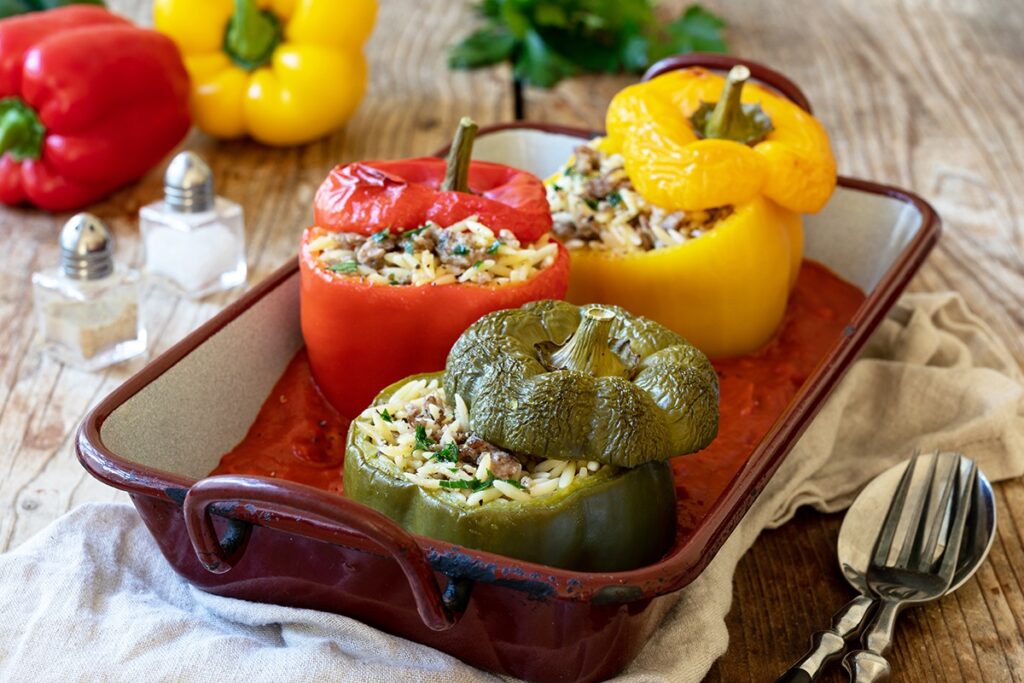 Von den Paprika die Deckel abschneiden, innen ausputzen und mit heißem Wasser übergießen. Ein paar Minuten stehen lassen, dann abgießen. Das lässt sie milder werden. Aber nicht notwendig.