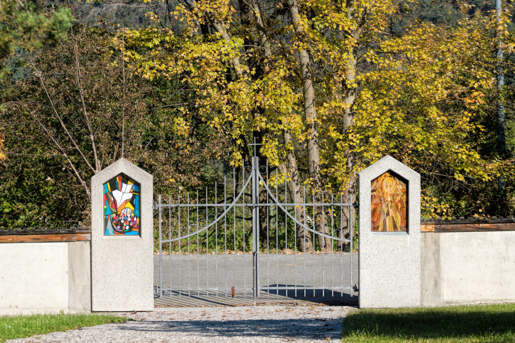 Es ziert den Ausgang des Friedhofs bei der Murkapelle. Im rechten unteren Eck findet man den Namen der großartigen Inzinger Künstlerin Christine Adler und das Jahr 2015.