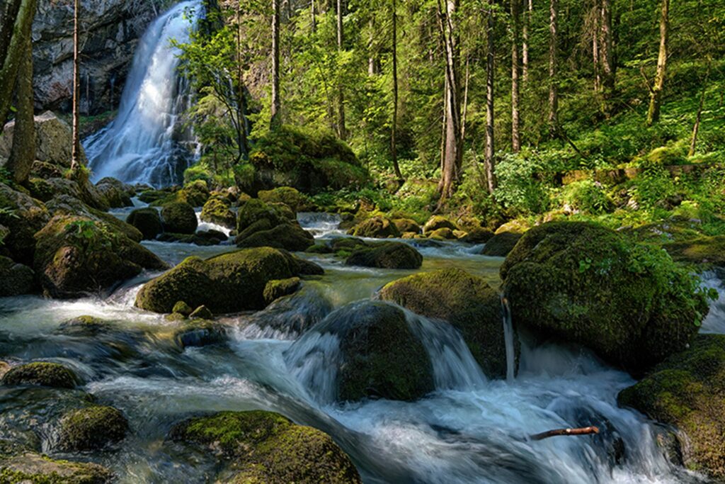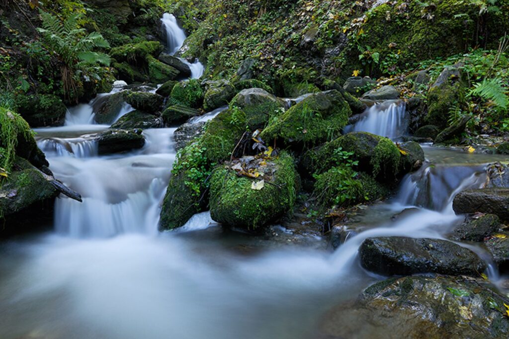 Ein einigermaßen „natürlicher“ Belichtungszeitwert lässt sich für das Fotografieren von fließendem Wasser ermitteln. Meine persönliche Erfahrung hat mich gelehrt, dass Wasser meist dann am natürlichsten „fließt“, wenn die Belichtungszeit so um 1/10 Sekunde beträgt. Alle meine natürlich aussehenden Wasserbilder weisen Belichtungszeiten zwischen 1/5 bis zu 1/25 Sekunde auf. Bei kürzeren Zeiten wirkt das fließende Wasser auf mich oft unscharf. Erst wieder bei sehr kurzen Zeiten kehrt Schärfe ein, lässt das Wasser dann aber „einfrieren“. Belichtet man deutlich länger als 1/5 Sekunde, kann das auch sehr schön aussehen, wirkt aber nicht mehr unbedingt wie natürliche Wasseroberfläche.