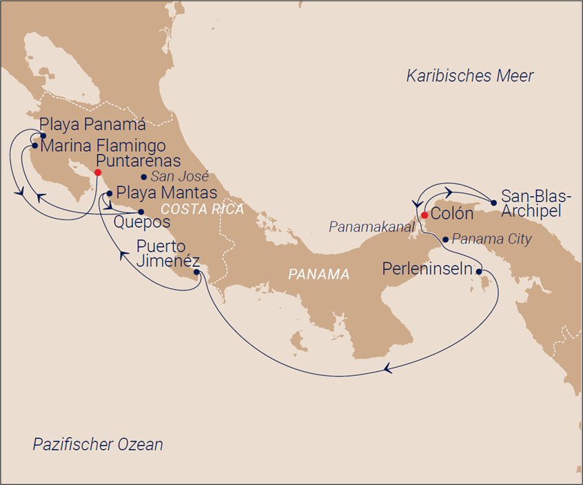 Am ersten Tag nach dem Ablegen werden die San Blas Inseln besucht. Diese Inselgruppe besteht aus 365 Inseln, die alle im Besitz von Frauen sind. Das Gebiet ist autonom und wird von den Kuna selbst regiert und durch die eigenständige Wirtschaft abgesichert. Die Kuna sind sehr verbunden mit der Natur und wollen daher Massentourismus vermeiden. Sie bestimmen selbst, welche Touristen das Land betreten dürfen.