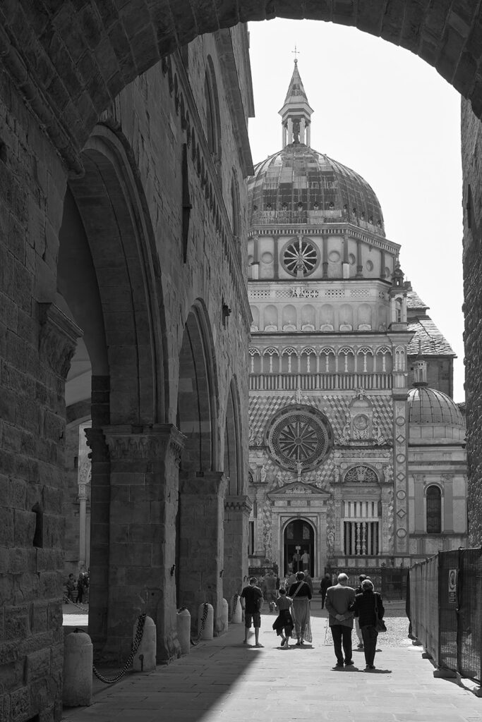 Eine ähnliche Wirkung zeigt sich, wenn man ein Motiv findet, welches als Bilderrahmen dienen kann. Das können in der Natur z.B. Felsen oder Bäume sein. Im folgenden Beispiel war es ein Torbogen in der Altstadt von Bergamo.
